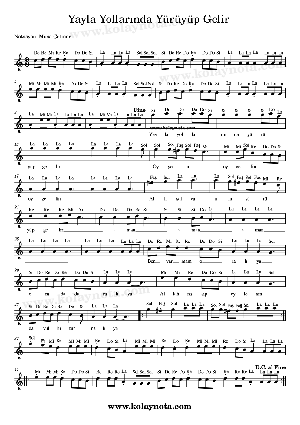 Yayla Yollarında Yürüyüp Gelir – Kolay Nota by Musa Çetiner