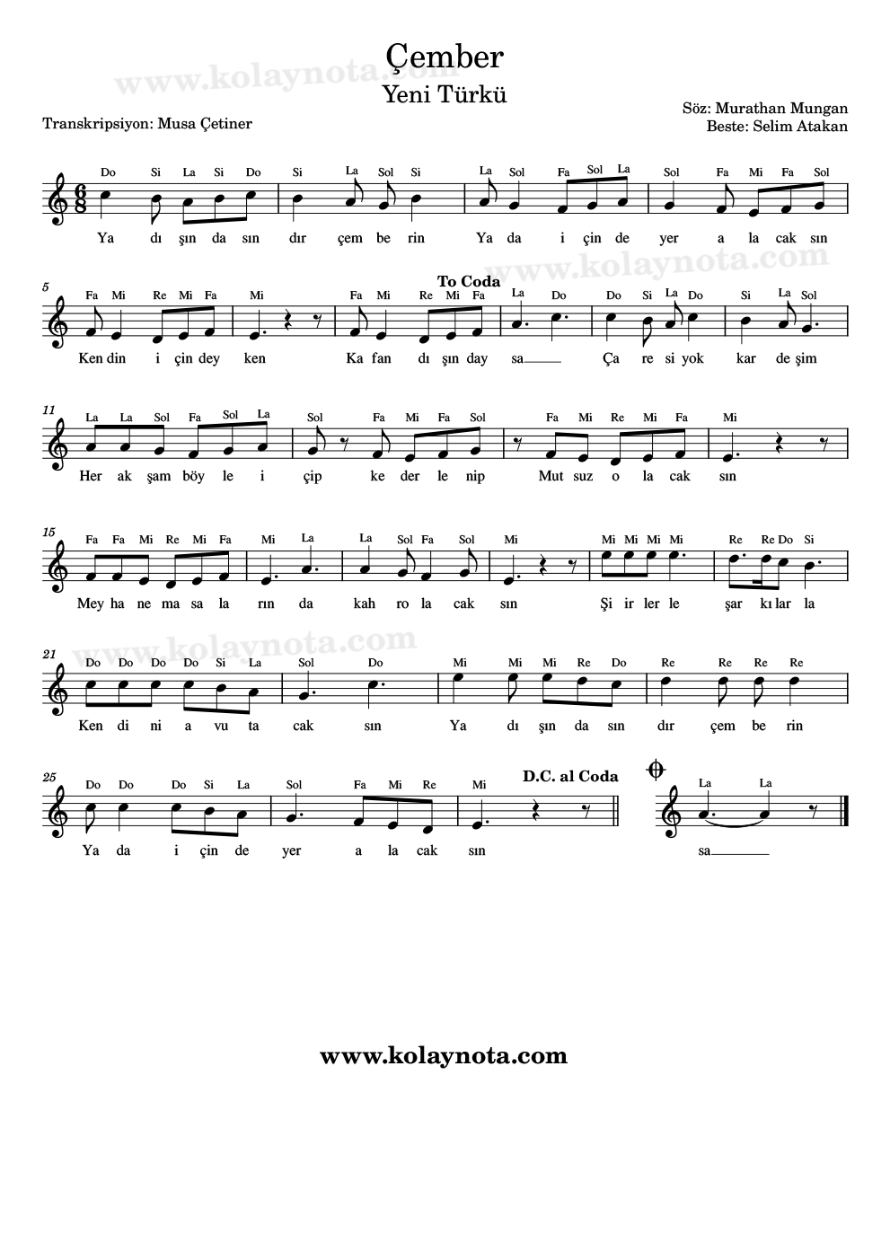 Çember, Nota. Bestesi Selim Atakan, sözleri Murathan Mungan’a ait olan ve Yeni Türkü grubunun seslendirdiği bir şarkı. Grubun 1983 yılında çıkan “Akdeniz Akdeniz” albümünde yer almış. Sol# karar sesinde seslendirilmiş, ben La karar sesinde notaya aldım.