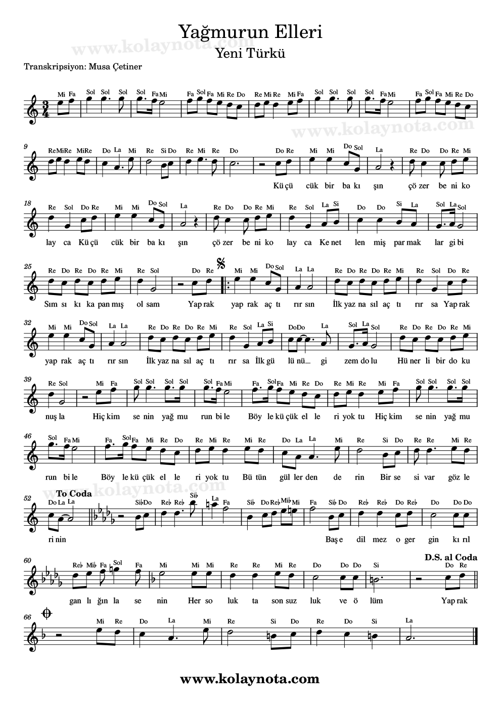 Yağmurun Elleri – Kolay Nota