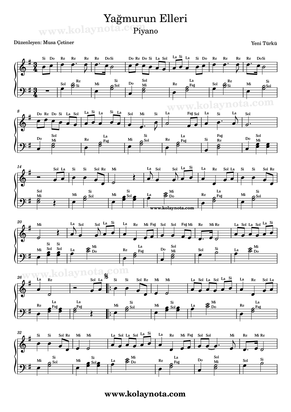 Piyano düzenlemesini akor eşlikli biçimde hazırladım. Akorla piyano çalmaya alışıksanız kolayca çalabilirsiniz. Youtube kanalımdaki piyano videosunu mutlaka izleyiniz, düzenleme hakkında bir fikir verecektir.