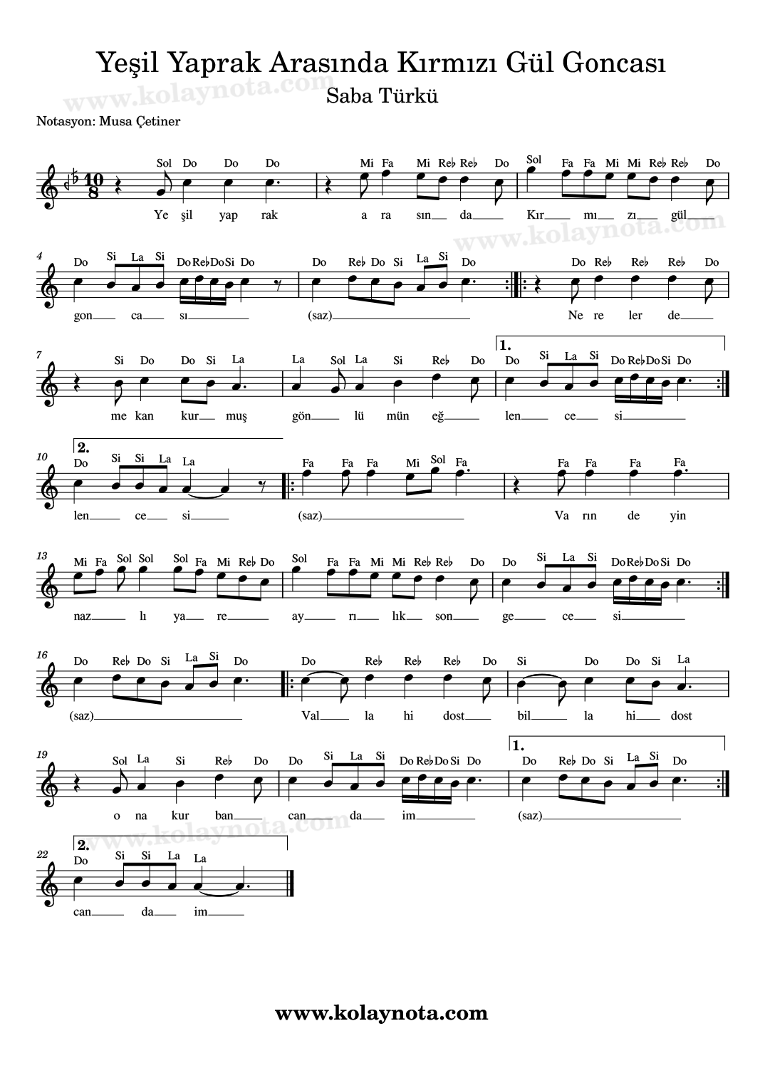 Yeşil Yaprak Arasında Kırmızı Gül Goncası, Nota. Elazığ yöresine ait, Saba makamında bir türkü. La karar sesinde notaya aldım, Türk müziği çalgılarında Si ve Re seslerini komalı çalmanız gerekiyor. Batı müziği çalgılarında Si notasını doğal, Re notasını bemol çalabilirsiniz.