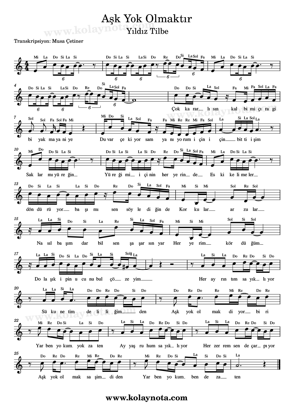 Aşk Yok Olmaktır, Nota. Yıldız Tilbe’nin bir şarkısı. Sonrasında Mabel Matiz’de şarkıyı yorumlamış. Fa# karar sesinde söylenmiş. Ben La karar sesinde notaya aldım. Kolay nota ve piyano düzenlemesini görebilir, keman, melodika, flüt, org gibi çalgılarda çalabilirsiniz. Notasyonu PDF ve imaj biçimlerinde görebilirsiniz.