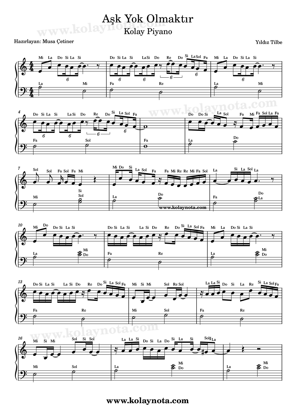 Aşk Yok Olmaktır şarkısının notası ve piyano düzenlemesi bu yazının konusuydu. Sitemde pop müzik türüne ait çok sayıda şarkıya ulaşabilir, keman, piyano, melodika, flüt, org, bağlama gibi birçok müzik enstrümanında çalabilirsiniz. Teşekkürler.