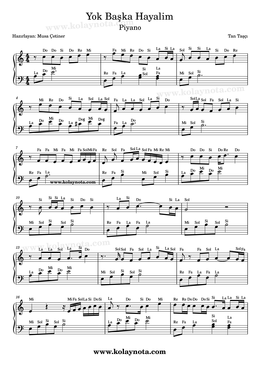 Yok Başka Hayalim, Nota. Tan Taşçı’nın şarkısı. Kürdi makamında bestelenmiş. Mi karar sesinde notaya aldım. PDF ve imaj formatında görüntüleyebilir, keman, piyano, melodika, flüt, org gibi çalgılarda çalabilirsiniz. Şarkının bir stüdyo kaydı yok sanırım. Tan Taşçı bir konserinde yorumlamış. Şarkıyı bilmiyorsanız mutlaka dinleyiniz.