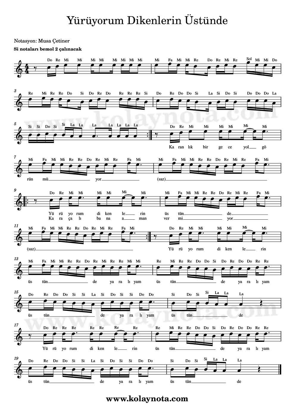 Yürüyorum Dikenlerin Üstünde Türkü Notaları