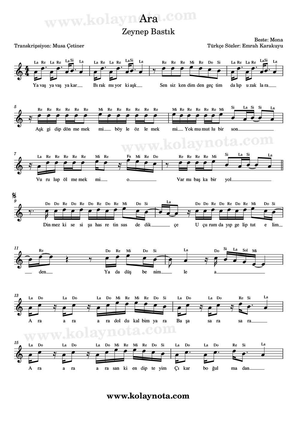Ara; Zeynep Bastık’ın türkçe sözlerle yeniden yorumladığı bir şarkı. Bestecisi Mona, türkçe sözlerini ise Emrah Karakuyu yazmış. Kolay nota ve Kolay Piyano düzenlemesini paylaşacağım.