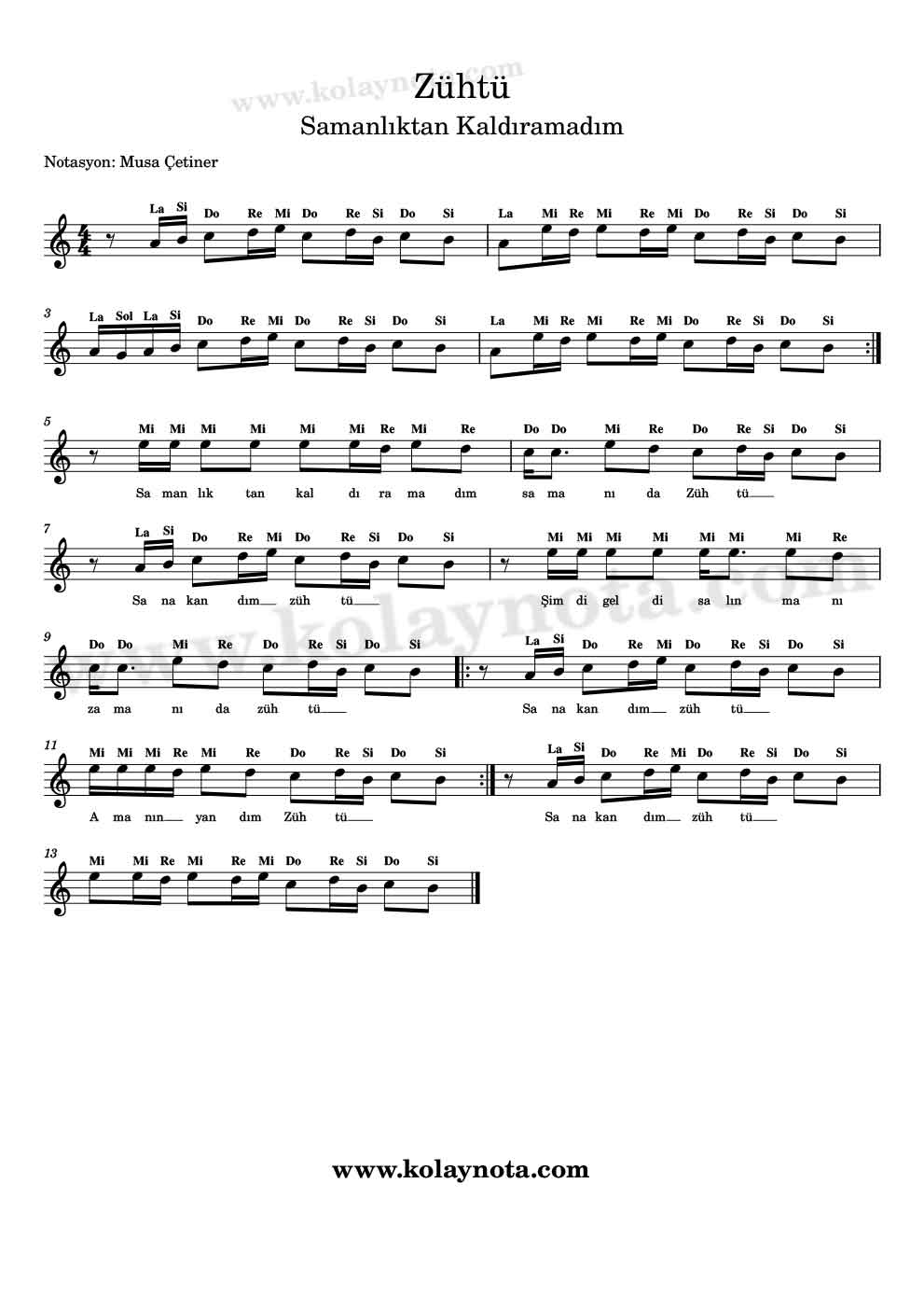 Zühtü türküsünü melodika, keman, org, flüt, bağlama çalgılarında do re mi ve kolay notalarına bakarar doğru bir şekilde çalabilirsiniz. Başarılar.